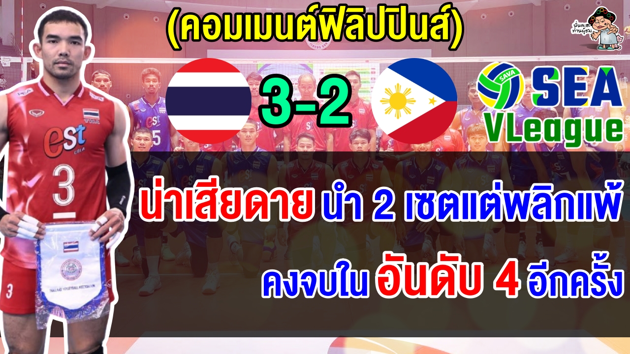 ทีมไทยพลิกสถานการณ์เอาชนะฟิลิปปินส์ไปได้อย่างน่าประทับใจ 3-2 เซต (18-25, 18-25, 25-14, 25-23, 15-7) … นับเป็นชัยชนะนัดที่ 2 ของไทยในการแข่งขันในครั้งนี้ … ในขณะที่ฟิลิปปินส์พ่ายแพ้เป็นนัดที่ 2 … การแข่งขันในครั้งนี้เป็นส่วนหนึ่งของการแข่งขัน SEA VLeague ซึ่งเป็นการแข่งขันวอลเลย์บอลชั้นนำของอาเซียน … ในอดีตประเทศไทยเป็นประเทศที่มีอิทธิพลมากในวงการวอลเลย์บอล … โดยเฉพาะอย่างยิ่งในกีฬาซีเกมส์